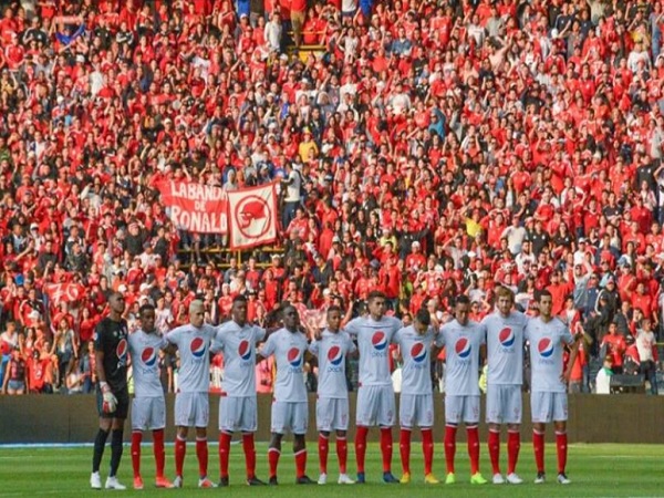 Otra de las teorías acerca del origen del nombre y los colores, una de la más aceptadas, dice que el nombre fue escogido como homenaje a America Football Club (el equipo de 1918) y la elección de los colores se debe a que en la gira de 1931 algunos miembros del equipo asistieron, como espectadores, a un partido de baloncesto entre los quintetos de Unión Colombia y los Diablos Rojos. Estos últimos vestían íntegramente de rojo y como consecuencia de ello América determinó seguir jugando de rojo, de arriba abajo, colores que se oficializaron hacia el año 1936.